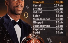 罗纳尔迪尼奥亲手将金球奖杯交到登贝莱手中...
